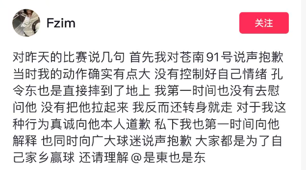 他说自己私底下,有第一时间去跟孔令东解释。并向广大球迷道歉。
