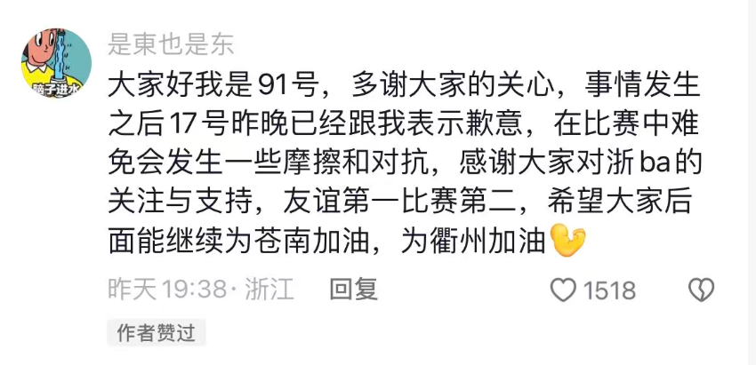 总之,既然衢州17号承认了自己的错误并道歉,那这件事也可以让它翻篇了,切勿影响两队之间的友谊。